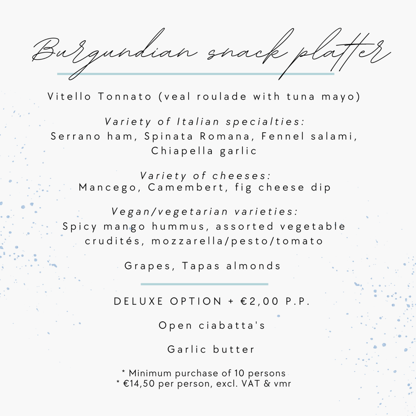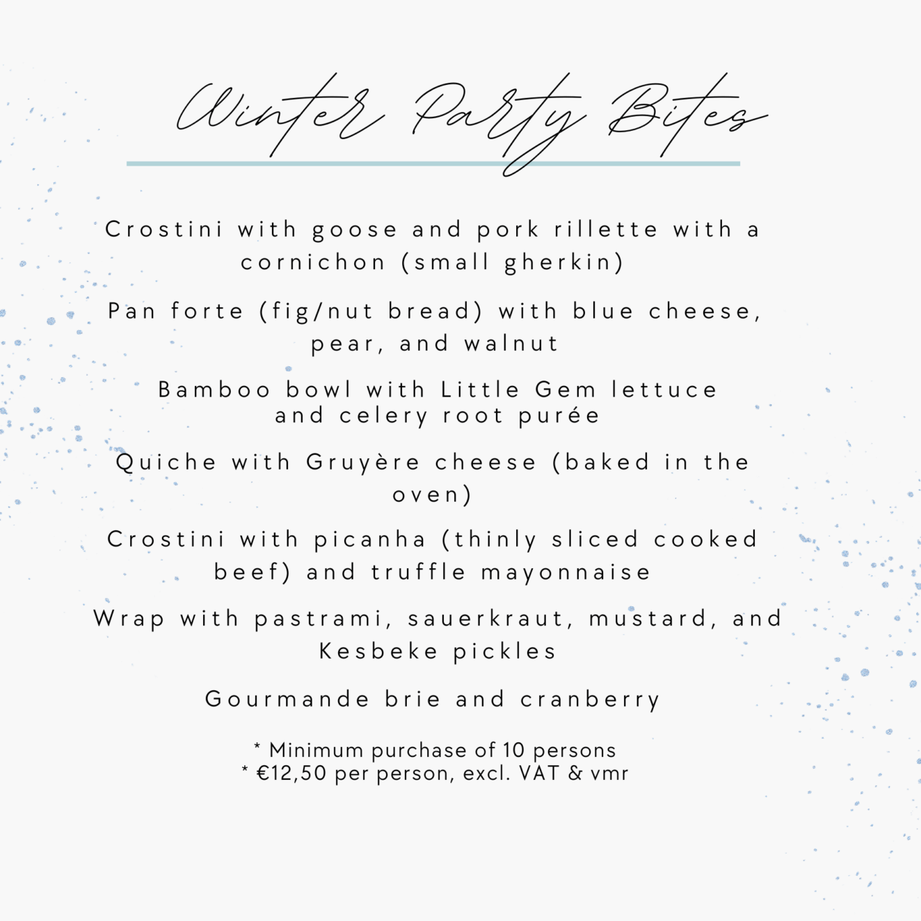Would you like to enjoy with some party bites with us during your private boat cruise during the Amsterdam Light Festival? Then treat yourself to our luxurious winter party snacks, specially designed to make your experience even more festive, from richly topped crostini to wraps with pastrami and sauerkraut. The perfect snacks to get you through the cold winter days.